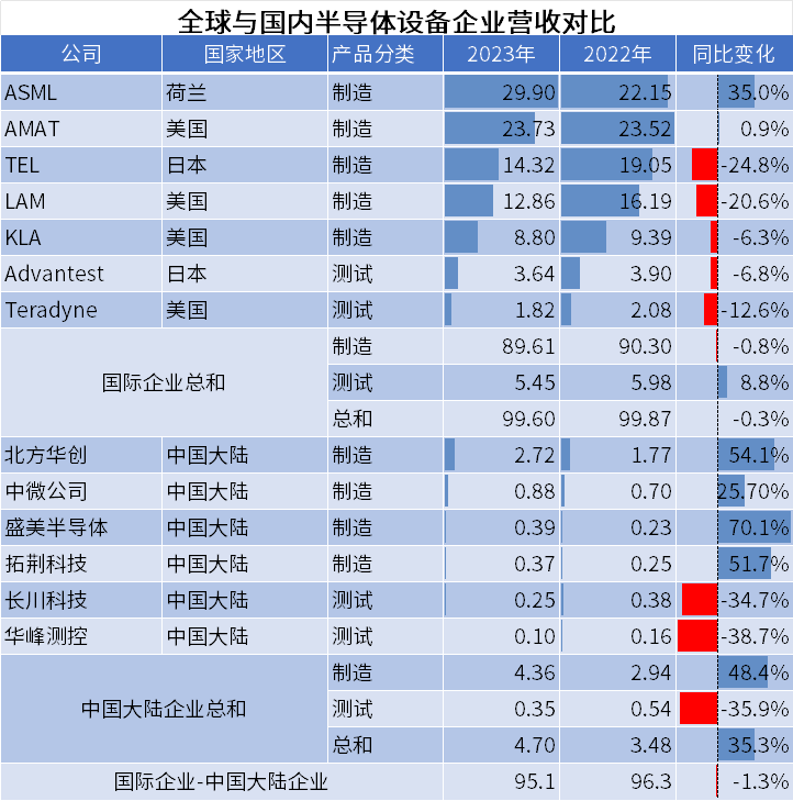 我國半導體設備行業雖有較大的進步,但不論在技術還是規模方面,相對美國、日本企業仍有巨大差距。全球TOP1荷蘭ASML為光刻機巨頭,2023年營收299億美元,同比提升35.0%,我國大陸地區北方華創營收27.2億美元,不足其10%。美國應用材料(AMAT)營收237.3億元,是我國大陸中微公司營收8.8億美元的近27倍。